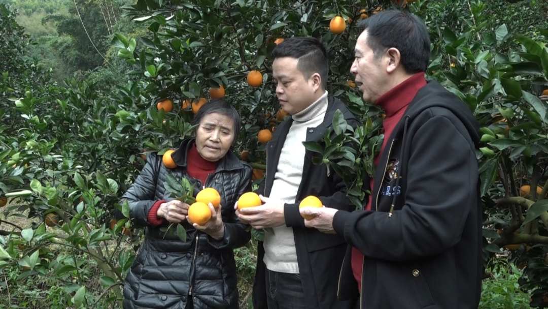 果園里橙香四溢,黃澄澄的臍橙掛滿枝頭,工人們嫻熟的將臍橙摘下。果樹(shù)下,幫助朱招弟與永輝牽線搭橋的愛(ài)心人士游厚壽也來(lái)看望朱招弟一家。